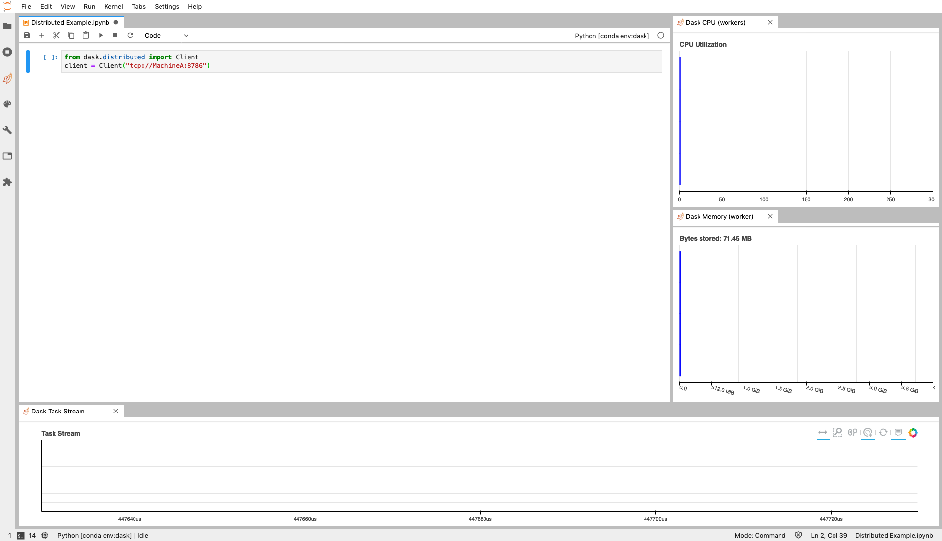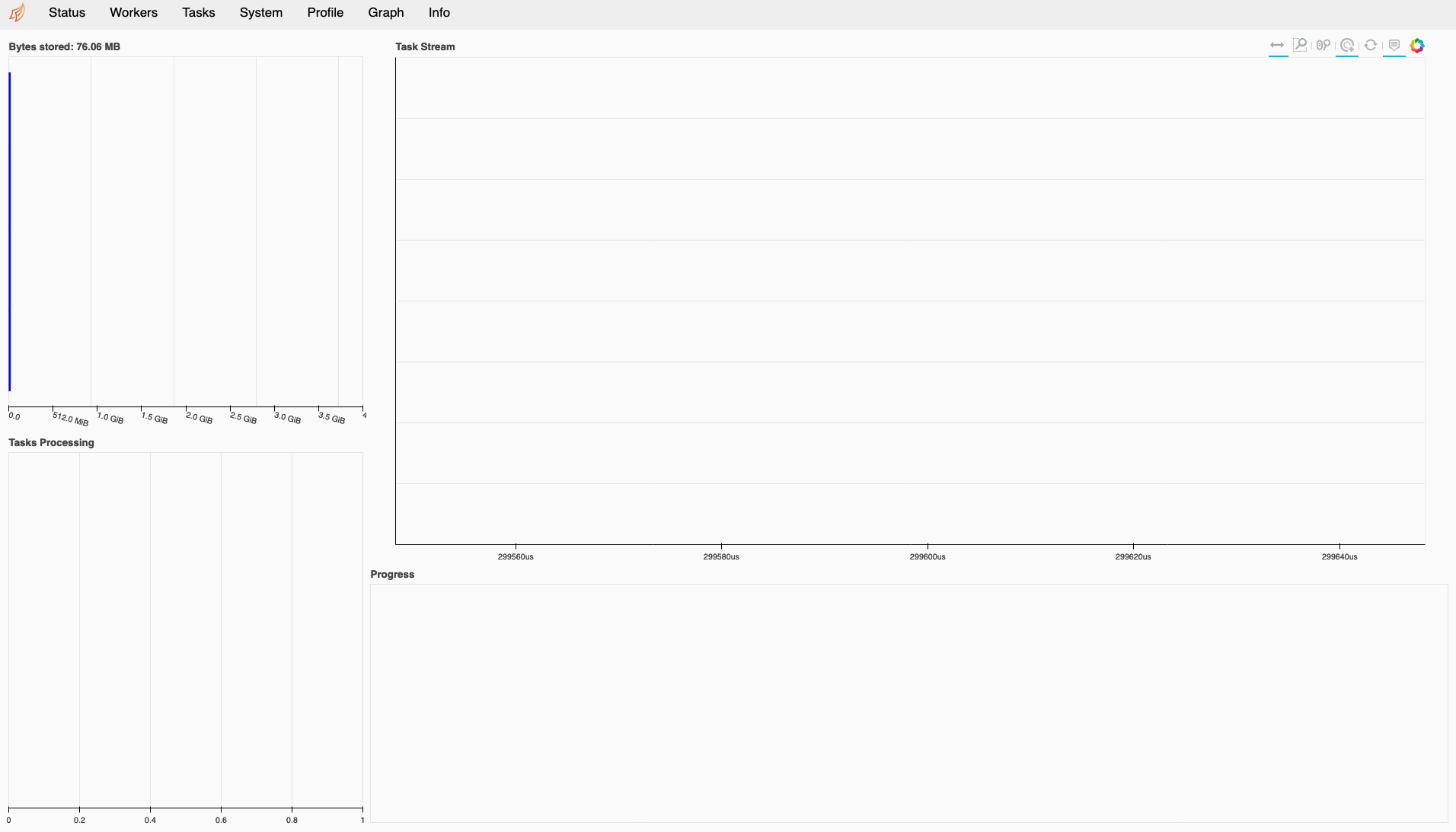 In this minimal example we have installed Dask on some machines, ran a distributed scheduler on one of them and workers on the others. We then connected to our cluster from our Python session and opened the dashboard to keep an eye on the cluster.